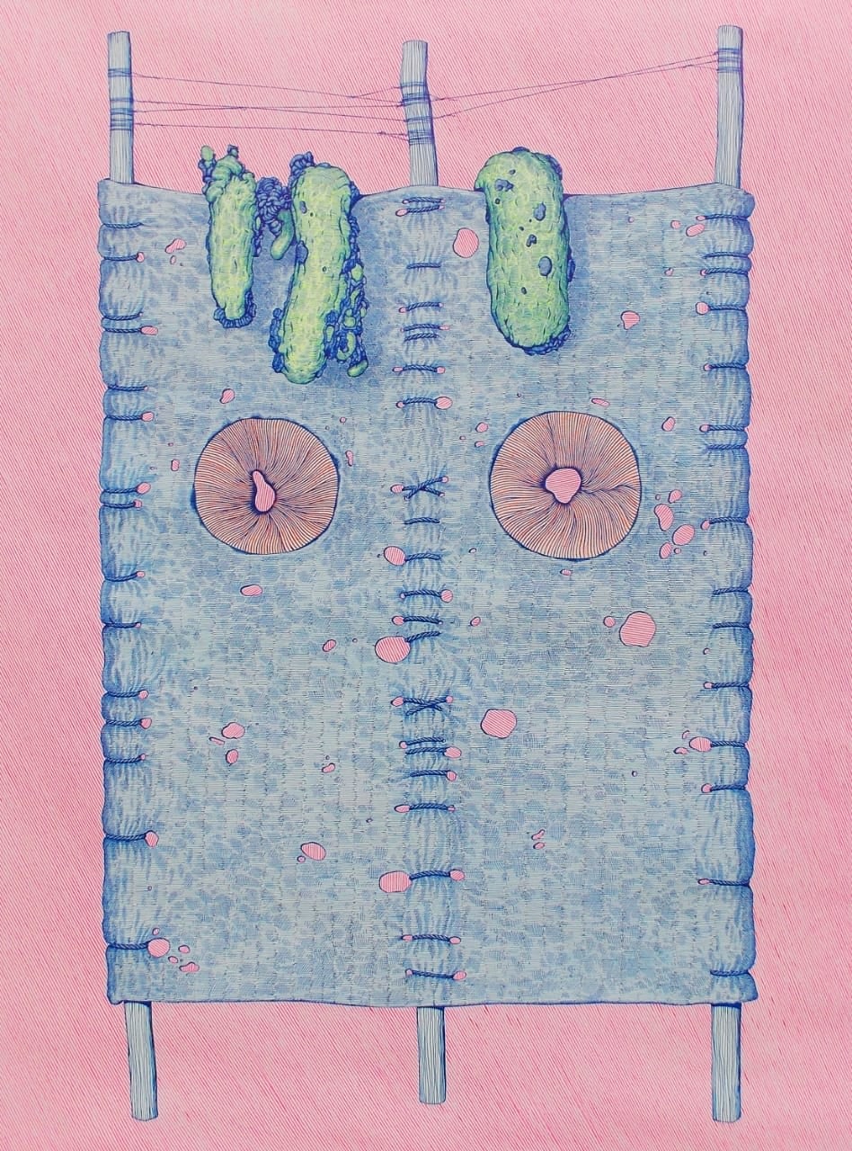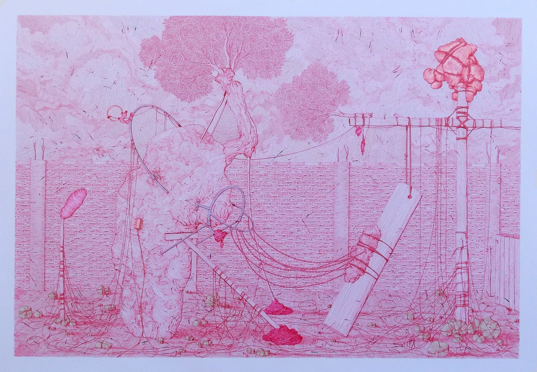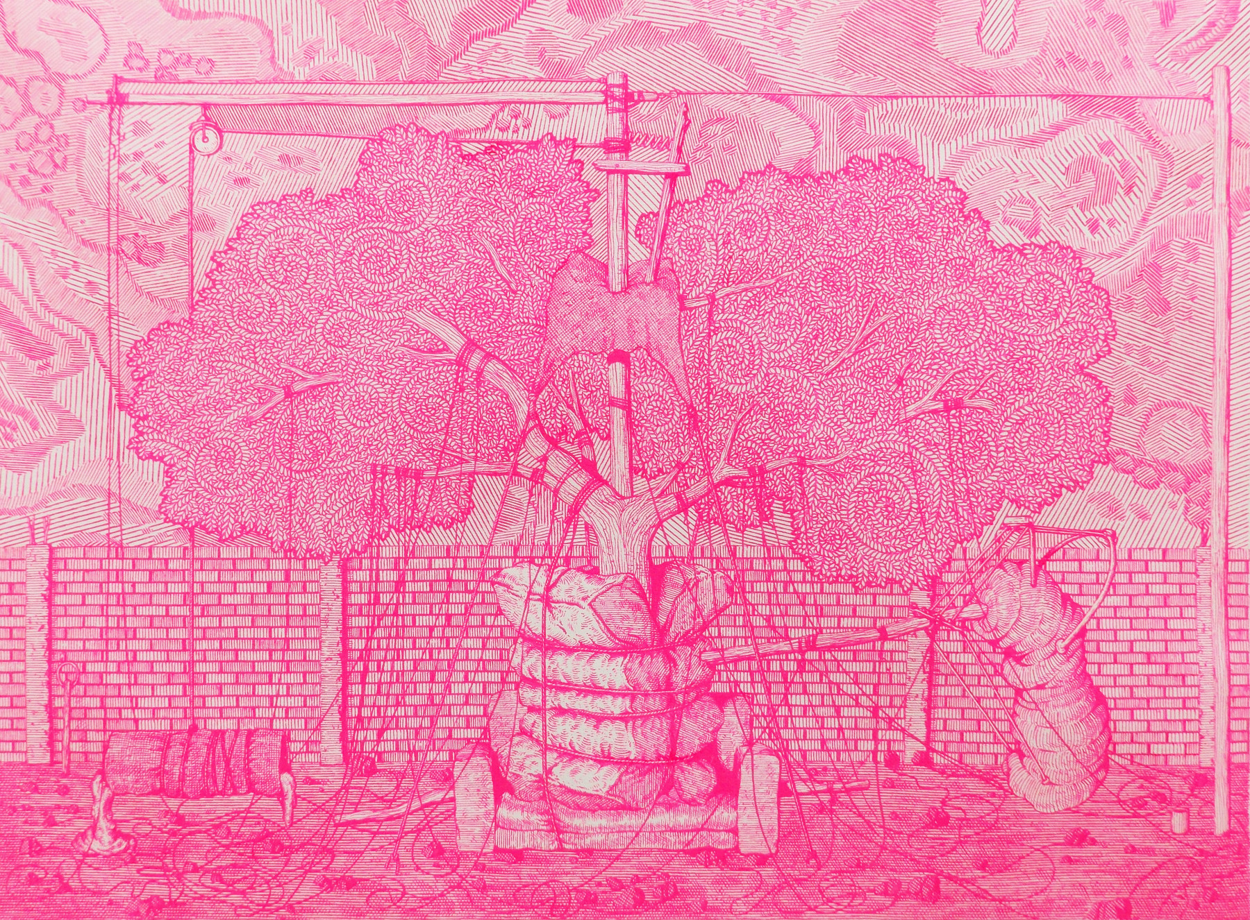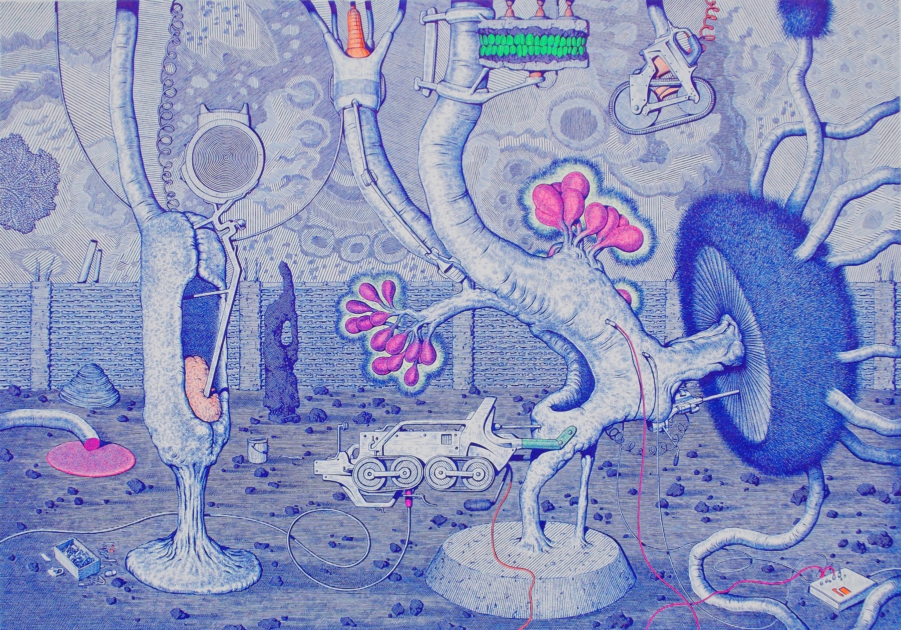 Mauro Koliva's work is heavily influenced by the tumultuous historical trajectory of Argentina. His meticulously detailed landscape drawings are vibrantly colorful fields of organic, mechanic, and biomorphic elements. The lavish and diverse images of nature and material come together to create surreal fields that surge with dynamic energy and movement. Collectively, the drawings present a theme of contradictory images depicting a world of nature and machinery, stillness and movement, the real and imaginary. The result is an overwhelming sense of industrialization that actively counters our natural world.