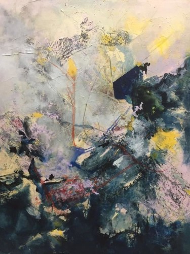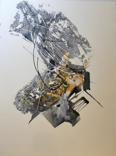 Isabel Turban’s abstract paintings are created from transfers, acrylic, charcoal and other mixed media applied in layers onto canvas or paper. Throughout Turban’s work process, collected maps gathered from various travels are the most significant material as they fuel inspiration for the work. For the artist, these maps represent happy moments, cultural experiences, and political history all at once. The finished paintings are a manifestation of these elements, which represent Turban’s own idyllic, inexistent realm. Ultimately, the physical places in the maps become unimportant in lieu of the memories that refuse to be forgotten.