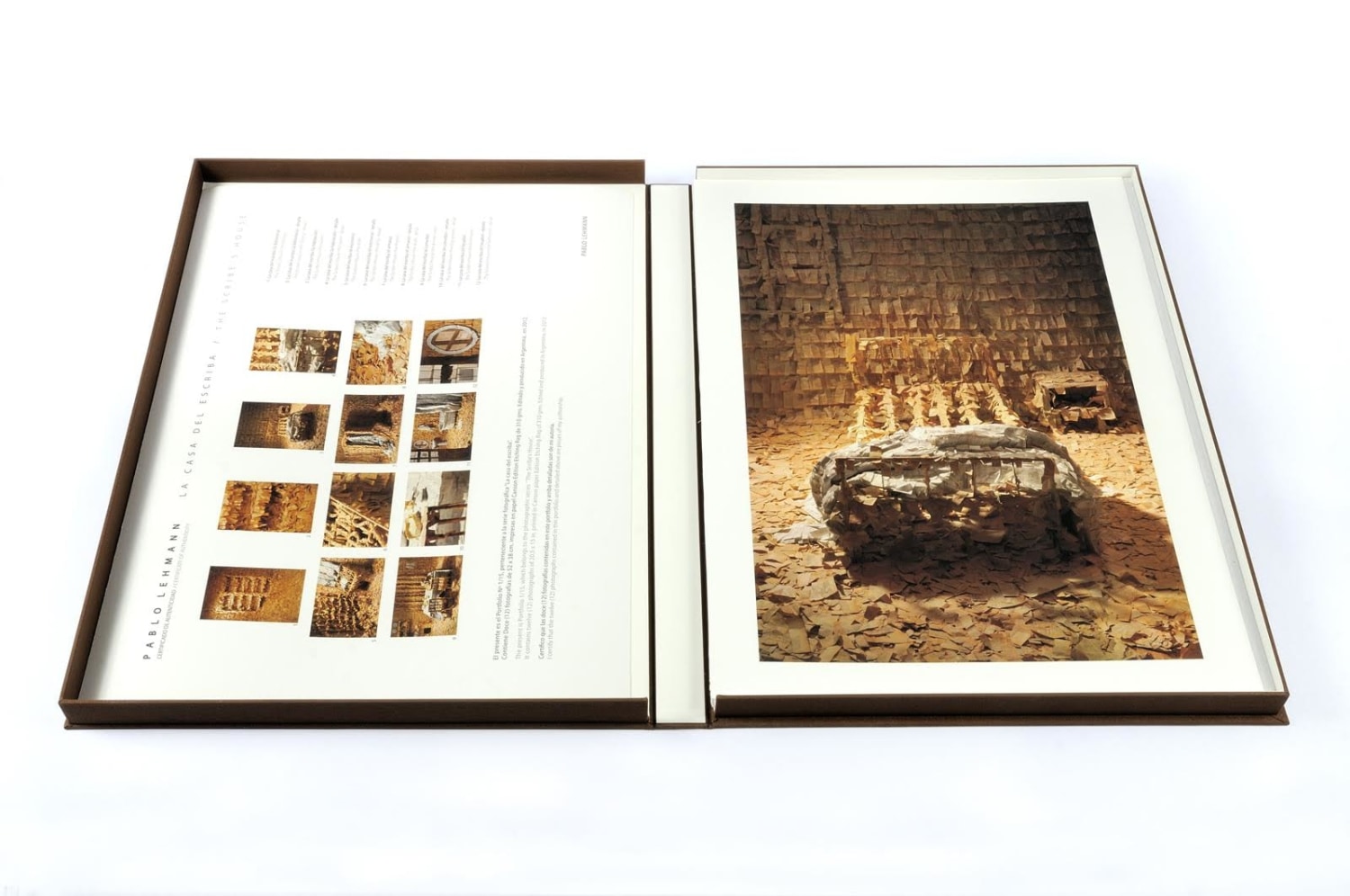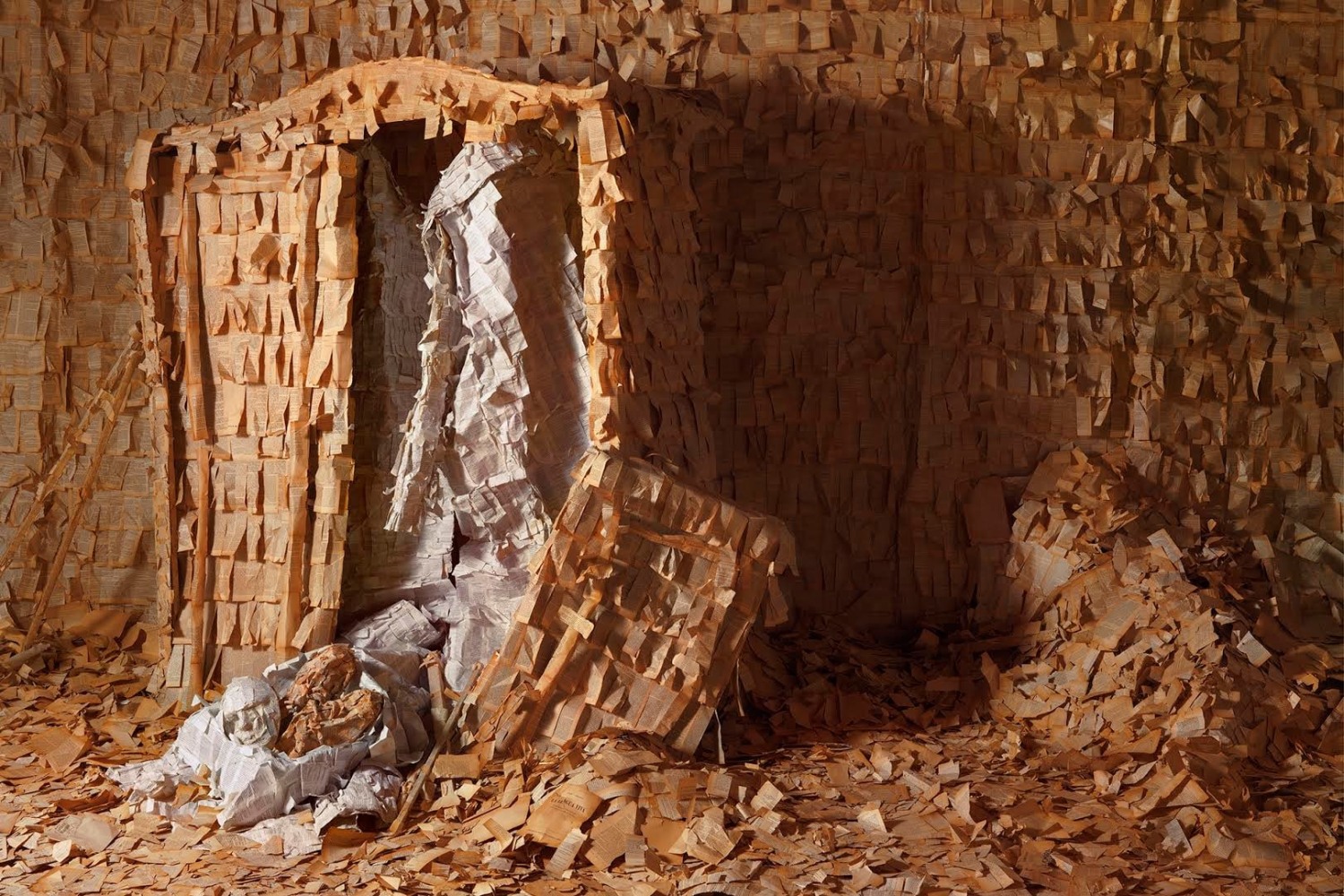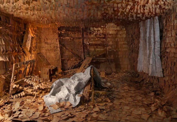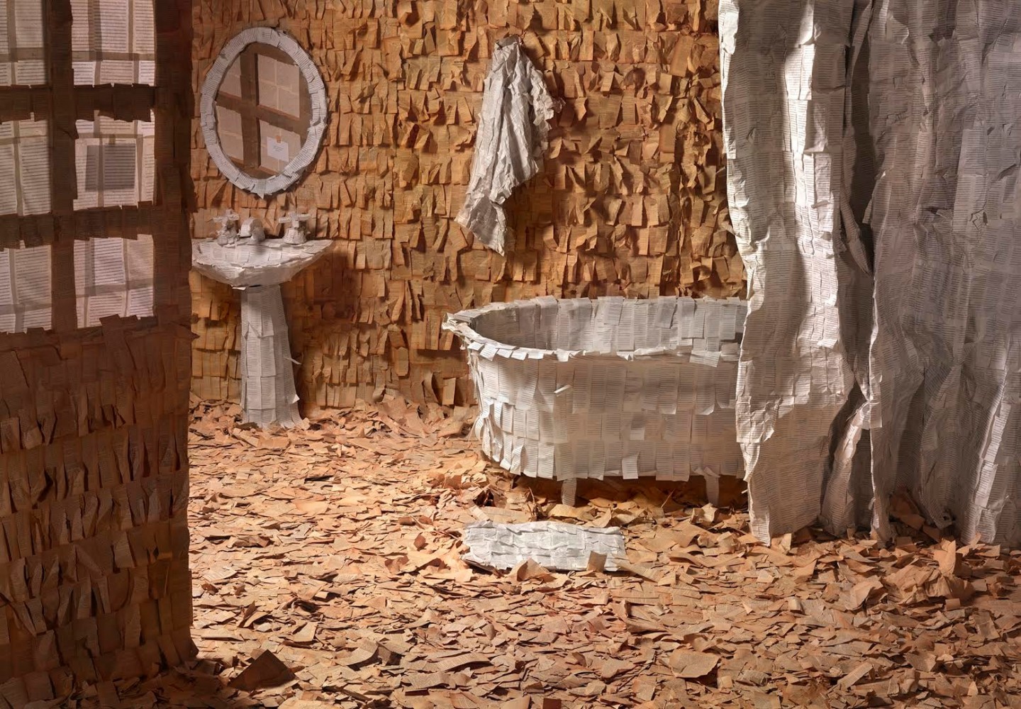 Artemisa Gallery presents The Scribe’s House a site-specific installation by Argentinian artist Pablo Lehmann at Art on Paper New York 2017. The Scribe’s House portrays the imaginary space of a living room inhabited by a writer. In this house, the torn texts of old books drape each crevice and corner of the room, wrapping the walls, floors, and furniture in its entirety. Inside the room, the text and words that exist within the books are much more than content in a space, they are layered, in an almost baroque treatment, to build a physical structure, to shape its form and represent the foundation of the place.