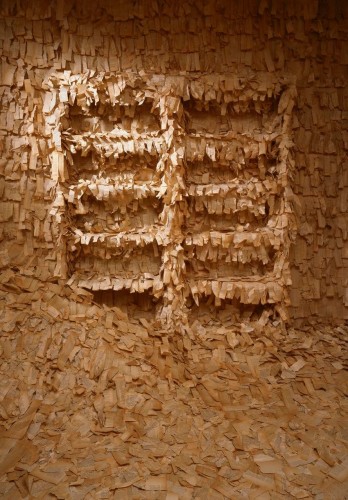 Besides their color and weathered age, there is no criterion in the selection of these books, due to the artist’s primordial search of re-inventing and signifying the texts through mixing their shreds with other books. The majority of the books are not historically significant masterpieces of language; however, the intention is for viewers to create their own texts and interpretations.