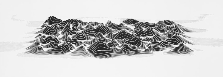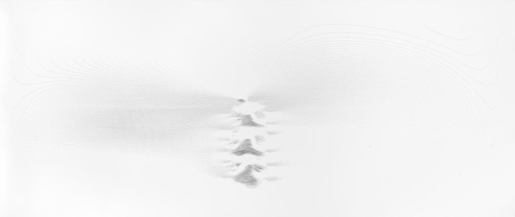 Through exposing deep trenches of earth’s inner layers and elevated mountainous surfaces, Terán’s landscape drawings capture the earth’s entire dimensionality. His work dialogues with natural landscapes and its rhythm creates metaphorical connections and reverberation aesthetics throughout. Through delicate and meticulous tracings, the drawings come alive to create a musicality that echoes throughout in an illusory three dimensional map of terrain.
