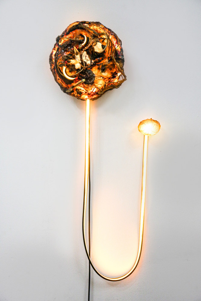 handmade bioplastic, roots branches, crystals, hemp fiber, fragments of wooden furniture, led lights, bark, hand sweep motion sensor switch