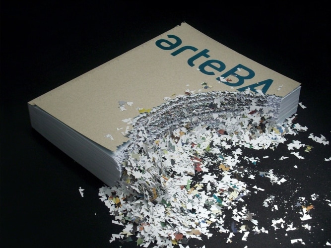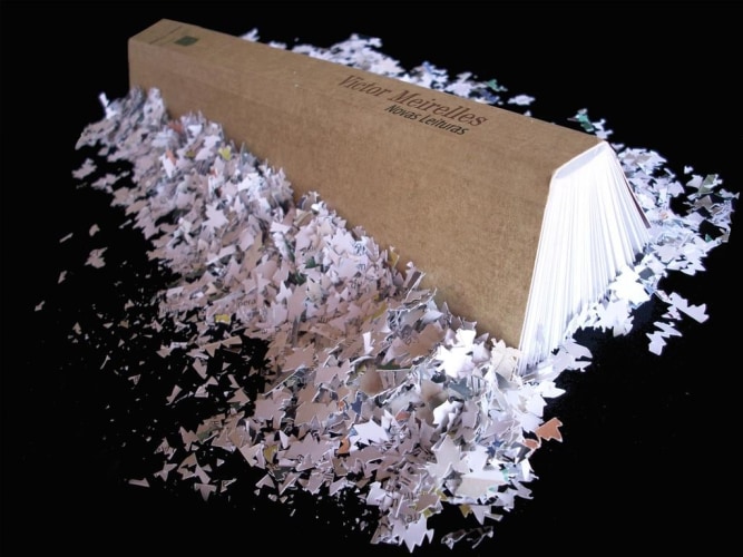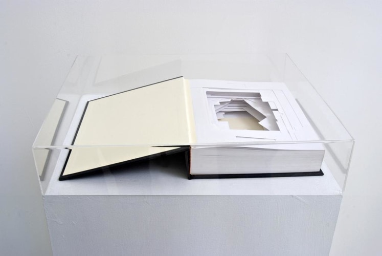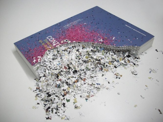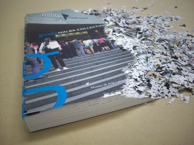 In his pierced book sculptures, Cristian Segura shreds, bends, and reworks books edited by Latin American museums, eliminating and muting their content entirely. The artist cuts up the edges of books into small pieces underlining the cultural obligations that art museums have to protect and look after the artistic patrimony that has been entrusted to them through donations and acquisitions. The use of the museum catalogue points directly to this medium as a place of officially sanctioned discourse and part of the mechanism that museum’s employ to legitimize the art itself.