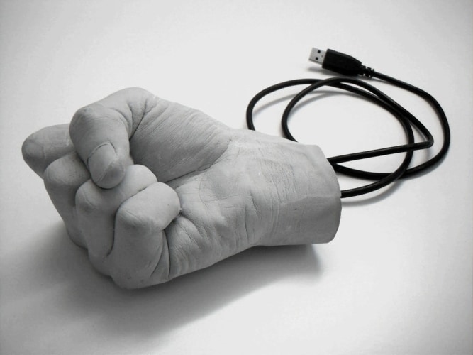 Segura’s ‘Fist’ is a video installation taken from the artist’s performance about the Museo de Arte Carrillo Gil in Mexico D.F. (2012). The video itself exists inside a sculpture of the fist of the artist that connects through a USB cord, allowing this moment in time to be experienced by the spectator. In this video, the artist energetically throws a sculpture replica of his head in 1:1 scale against the wall of the exhibition space. The head breaks the wall and stays trapped within the hole it ruptures. The museum restores the wall with Segura’s piece inside, leaving the work an element of the museum’s architectural structure. With this work, Segura invites the spectator to understand how museum’s have been able to integrate the critical eye within the institution itself.