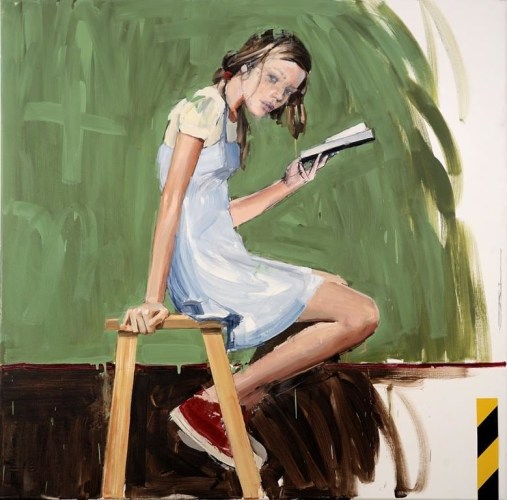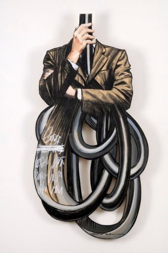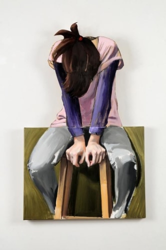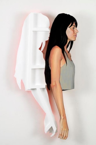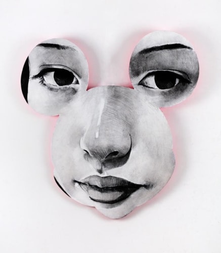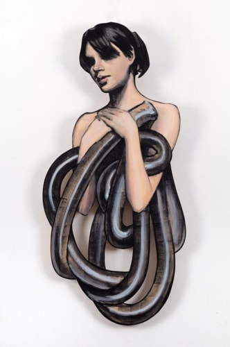 In Lepez’s wall sculptures, the blurring and smudging of the artist’s soft painterly brush strokes effectively juxtaposes the meticulous drawn lines of cutout board. Eye-catching and unusual in outline and form, the shapes and shadows on the wall play directly with the figures they portray to create a dynamic and soaring dialogue with the sitter and the surrounding space itself. Within each three-dimensional painting, Lepez explores the limitations of the wall itself as a background for art as the cut outs evade the limits of conventional foundation, making it nearly impossible to define and encompass each character’s entirety.